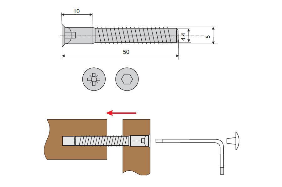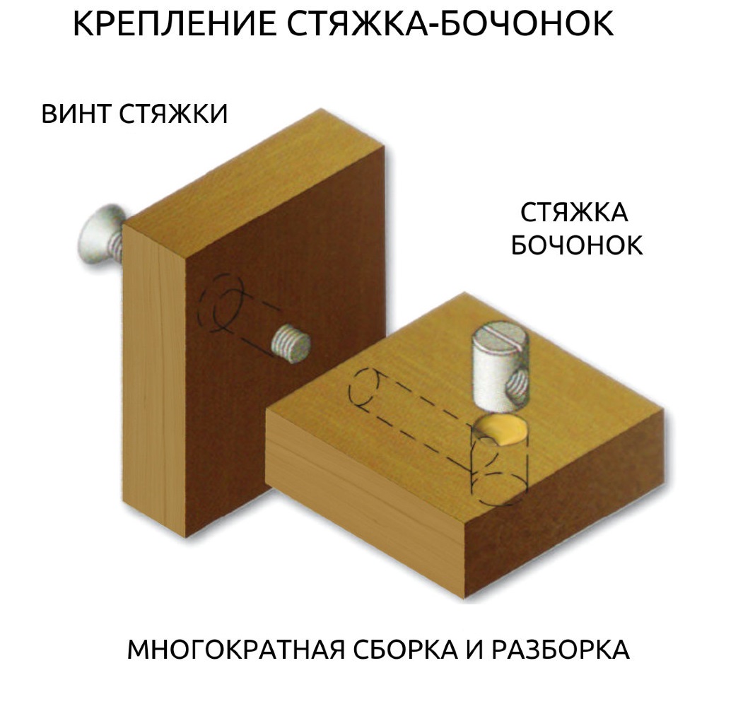 эксцентрик (снаружи не видимый) и конфирмат (снаружи заглушка)