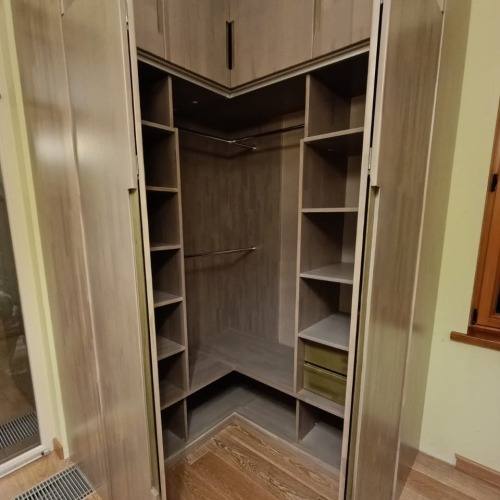 Размеры этого шкафа приближаются к гардеробной комнате, т.е. почти 1500х1700 мм, при глубине 560 и высоте 2800 мм. К особенностям можно также добавить складывающиеся деревянные фасады сверху и снизу, а также внутреннюю подсветку, с датчиком движения